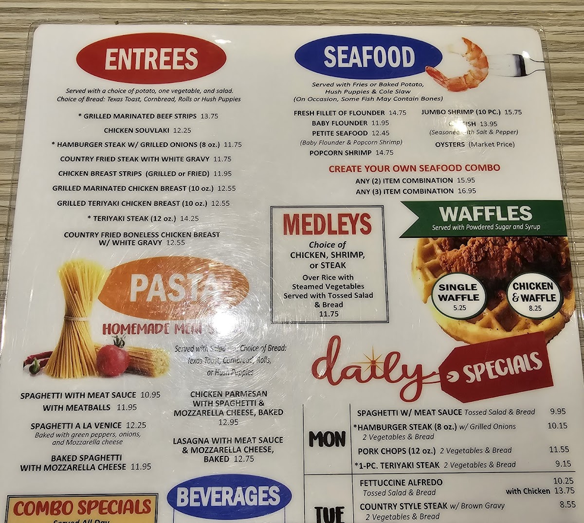 Served with fries or baked potato, hush puppies and coleslaw. Can NOT choose the same seafood item twice. *Oysters will have a $2.00 up-charge
